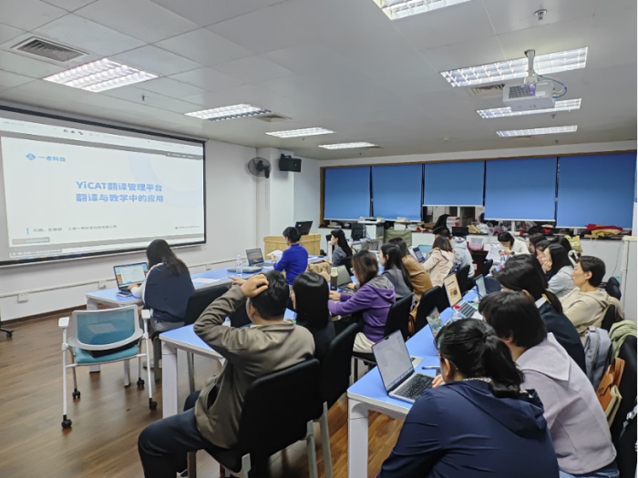 2025年11月6日晚上,太阳成集团tyc151cc邀请上海一者科技有限公司专家团队,为全院师生做“YiCAT翻译管理平台在翻译与教学中的应用”的专题培训。太阳成集团tyc151cc全体师生参加学习和实操演练,曹治柳经理主持培训。