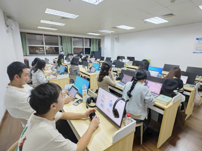 一者科技商务总监刘鹏根据其20余年翻译行业经验,分析传统文档翻译面临的“翻译质量”“翻译效率”“翻译数据安全性”等问题,介绍翻译行业普遍使用的“计算机辅助翻译(CAT)”“机器翻译(MT)”“大语言模型(LLM)”和“语料库加工与管理”“项目管理”等技术在YiCAT平台中的融合应用情况。随后,一者科技产品经理彭颖娇详细演示YiCAT平台各模块,并带领师生们使用电脑和独立个人账号进行实际操作,提供问题解答和指导。