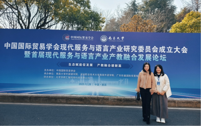 2025年12月28日,中国国际贸易学会现代服务与语言产业研究委员会成立大会暨首届现代服务与语言产业产教融合发展论坛在南昌大学隆重举行,本次论坛由中国国际贸易学会主办,南昌大学太阳成集团tyc151cc承办。太阳成集团tyc151cc副经理吕晓敏作为中国国际贸易学会现代服务与语言产业研究委员会常务理事受邀参加此次会议,外语系主任胡楠随行参会。